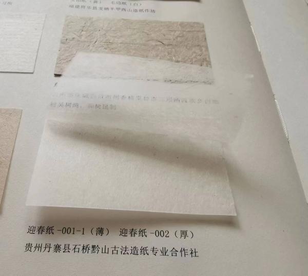 初次邂逅贵州省丹寨县的构皮纸,是在 2010 年,我们在国家古籍保护中心配发的各类修复纸中发现了一批略泛一点古朴红色的白纸。这批纸被分为1至13个号子,号码越大,纸张越厚。小号码的纸张,可以用来溜口、加固或托裱,遇到特殊书叶时,也可以直接用作补纸。至于大号码的纸,我们当时还嬉笑着说可以用来糊墙,现在想想真是孤陋寡闻,在修复一些少数民族文献时,没有比它更好的选择了。2013 年,丹寨县为配合我们调研,寄来数种样纸,而其中又有那款似曾相识的构皮纸。询问之下得知两者果然出自同一厂家,这无意中为我们纸库内的样纸寻到了根。随后,我们又从丹寨订了两种超薄的构皮纸,名字倒也好听,“迎春一号”“迎春二号”。也正是从那时开始,我与丹寨构皮纸的“掌门人”王兴武有了联系。