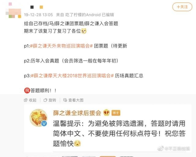 到了“考试”时,薛之谦全球后援会还会像老师一般仔细叮嘱歌迷们:为避免被筛选遗漏,答题时请用简体中文,不要使用任何标点符号!祝您答题愉快。