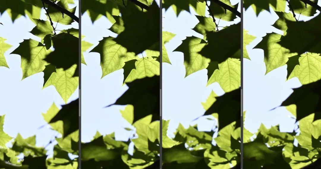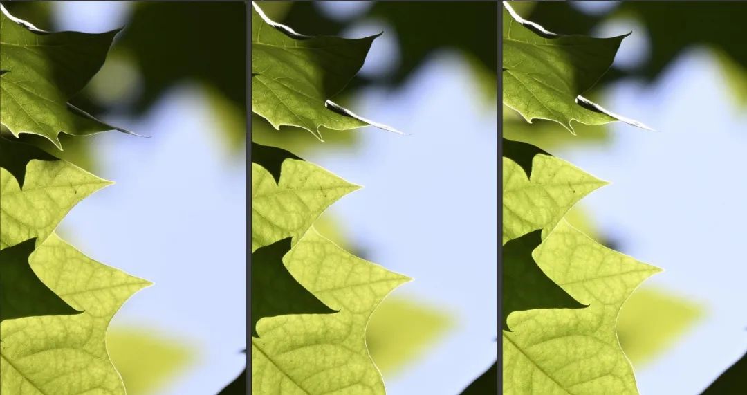 我们用镜头拍摄背光的树叶,由于树叶和天空形成大光比,可以通过观察树叶边缘,来判断色散程度。