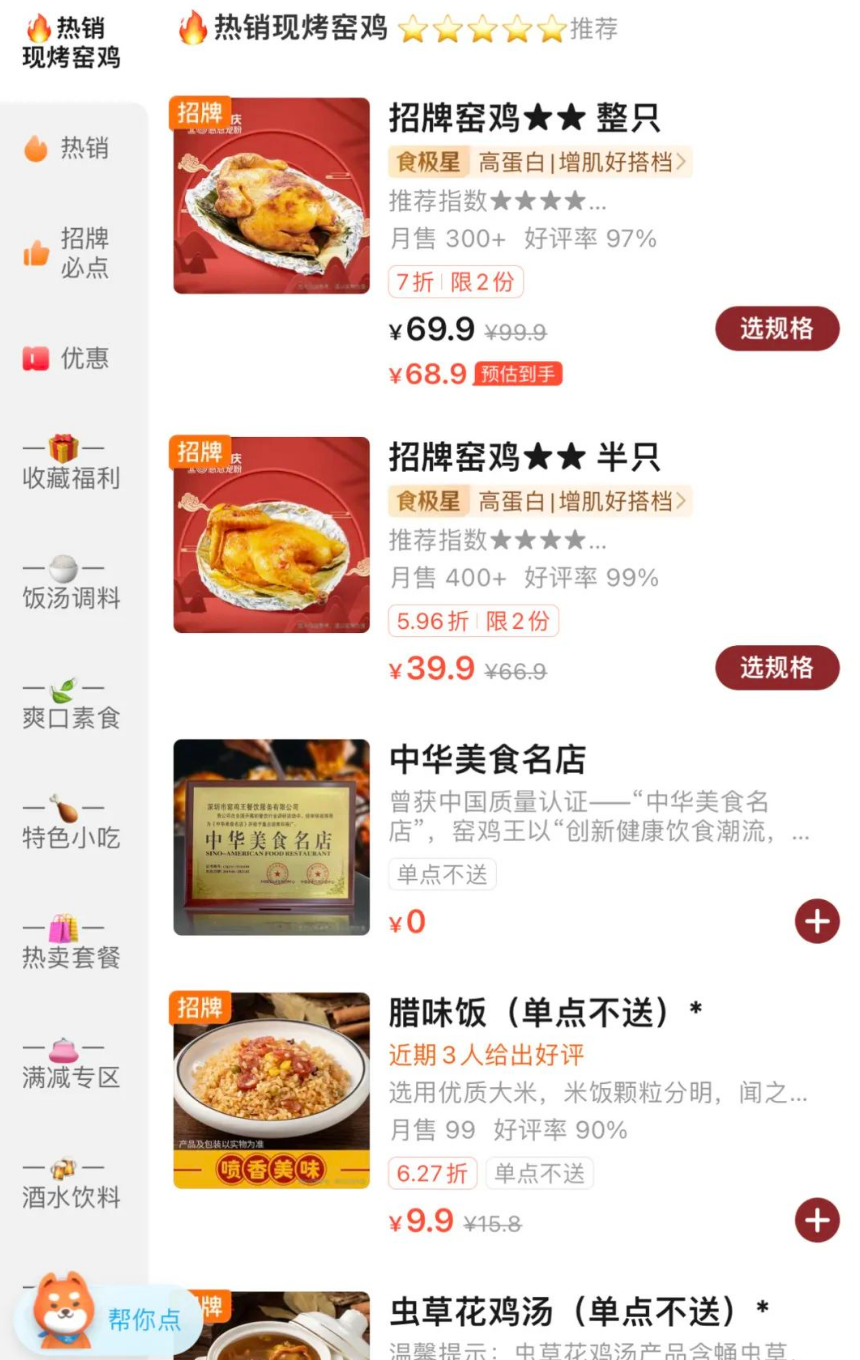 这家店是大单品策略,主打的就是窑鸡,半只,一翅一腿,刚刚好一顿饭,无论男女都能吃完。