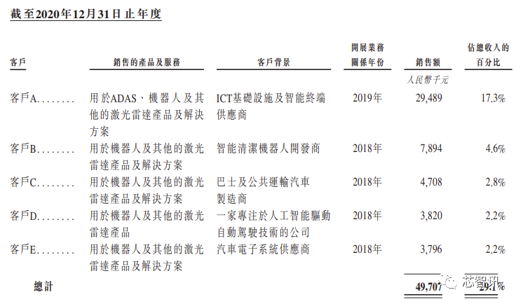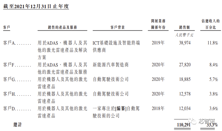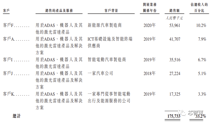 报告期内,速腾聚创来自最大客户的收入分别其在该等期间总收入的17.3%、11.8%及10.2%。截至2020年、2021年及2022年12月31日止年度,来自我们五大客户的收入分别占该等期间总收入的29.1%、33.3%及33.2%。