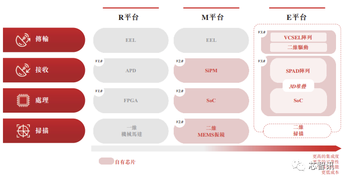 目前速腾聚创已有三种激光雷达平台:R平台、M平台和E平台。另外,速腾聚创正在设计及开发下一代激光雷达平台,即F平台。