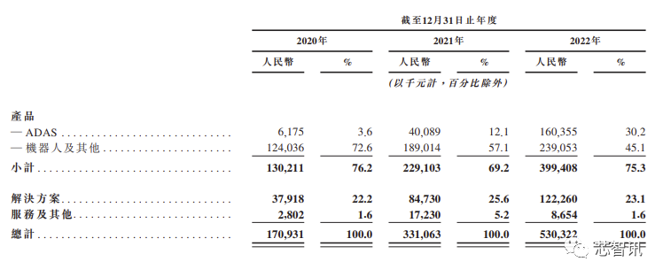 具体来看,报告期内,速腾聚创的主要的业务分别是ADAS产品、机器人产品、解决方案、服务及其他4大类。可以看到,ADAS产品贡献的营收占比由2020年3.6%,到2021年的12.1%,到2022年已经猛增至30.2%。而低毛利率的业务营收占比猛增,必然也将拉低整体的毛利率。
