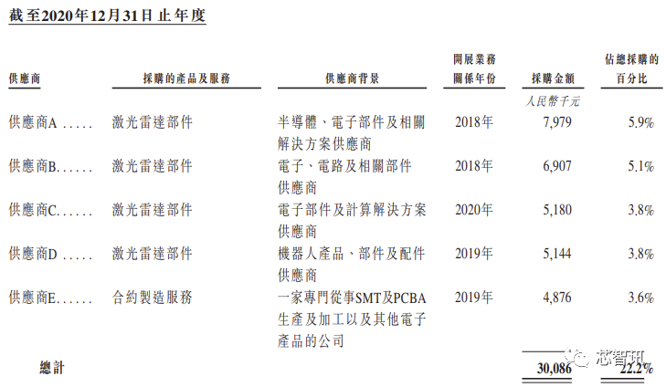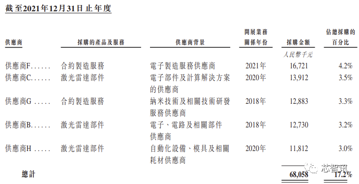 速腾聚创的主要供应商为原材料、硬件部件供应商及合约製造商。截至2020年、2021年及 2022年12月31日止年度,速腾聚创向最大供应商进行的採购分别占其于该等期间总采购的 5.9%、4.2%及7.8%。截至2020年、2021年及2022年12月31日止年度,速腾聚创向五大供应商进行的采购分别佔其于该等期间总采购的22.2%、17.2%及26.0%。
