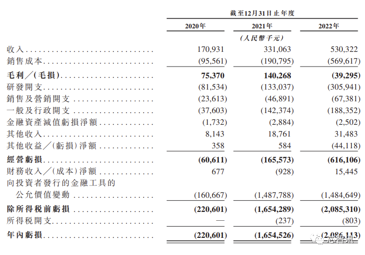 速腾聚创2020年、2021年、2022年营收分别为1.7亿元、3.3亿元和5.3亿元;产品毛利率分别为44.1%、42.4%、-7.4%;经调整亏损额分别为-5990万元、-1.08亿元、-5.63亿元;研发投入分别为0.81亿、1.33亿、3.05亿,分别占总收入的47.7%、40.2%及57.7%。