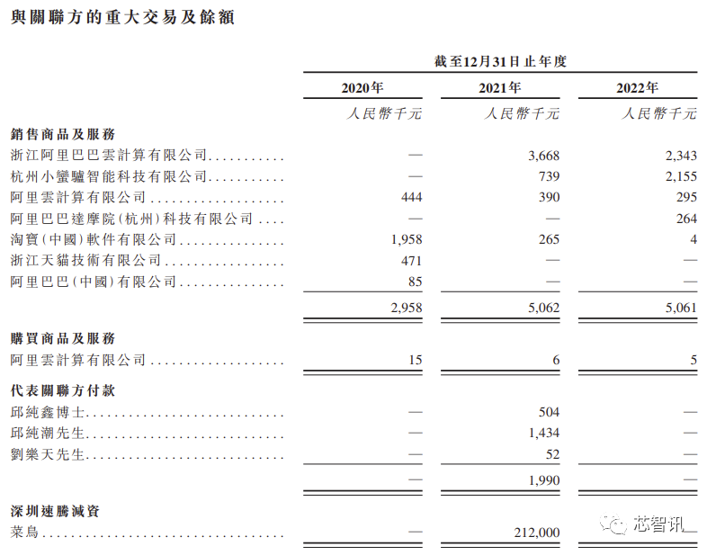 招股书显示,报告期内,速腾聚创向阿里系销售商品及服务的金额分别为295.8万元、506.2万元、506.1万元;购买阿里云服务花费1.5万元、6000元、5000元。