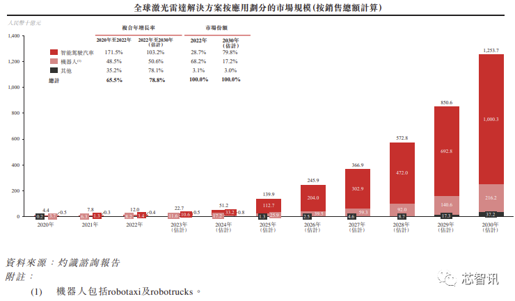 根据灼识谘询报告,2022年全球激光雷达解决方案市场规模为人民币120亿元,预计到2030年将增加至人民币12,537亿元,复合年增长率高达78.8%。在激光雷达解决方案的众多应用场景中,预计汽车应用将佔据整体市场的最大份额。