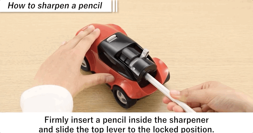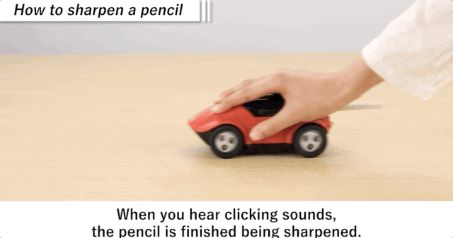 然后前后滑动车子,车子发出“咔哒咔哒”声,就表示正在完成削笔,同时铅笔屑会被装在车身的空盒子里。
