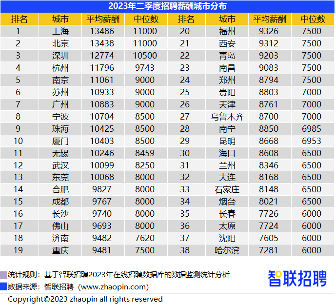 根据智联招聘2023年二季度《中国企业招聘薪酬报告》,在全国38个核心城市中,企业的招聘薪酬最高的为上海,上海、北京、深圳三座城市薪酬中位数过万。