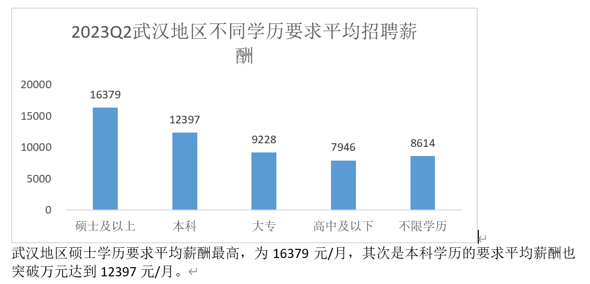 根据报告显示的数据来看,武汉地区硕士学历要求平均薪酬最高,为16379元/月,其次是本科学历的要求平均薪酬也突破万元达到12397元/月,大专学历要求平均薪酬也在9228元/月,均高于企业招聘薪酬的中位数,可见,在武汉的年轻人对于收入有着更高的期待。