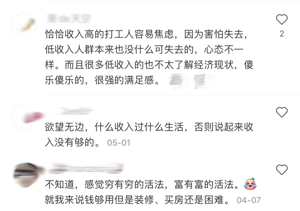 不过,还是有网友想得比较通透,认为不管赚多少钱,都有各自的活法,只要自己的欲望不要高于自己的收入,就不必感到过多的压力。