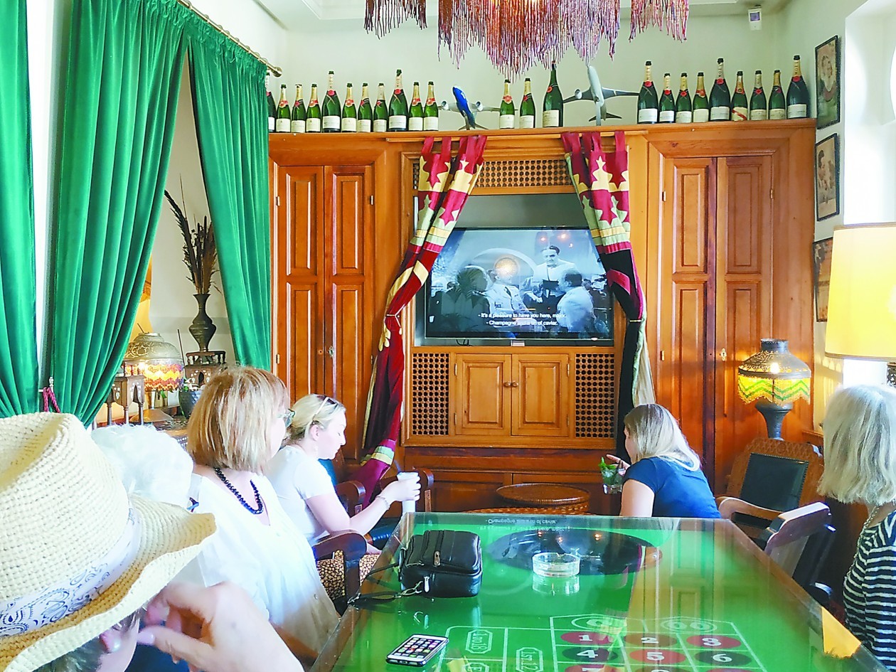 走进咖啡馆,记者仿佛穿越回1942年的卡萨布兰卡。这里的摆设和布置都极力还原了电影中的场景,让人仿佛置身二战中的北非。二楼一个厅室的墙上挂着电影海报、男女演员的剧照,还循环放映着不同语言字幕的《卡萨布兰卡》。来到这里的顾客可以边喝咖啡,边欣赏这部名片(如图,黄培昭摄)。