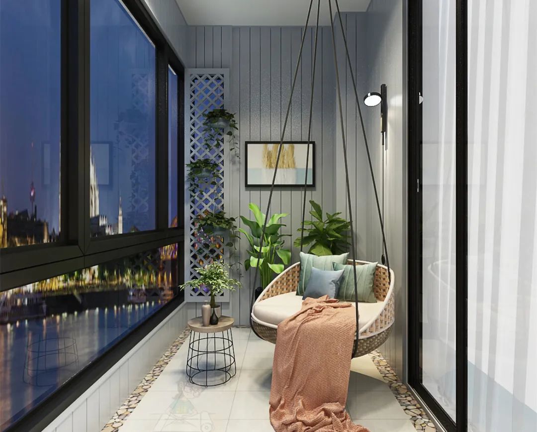 如果阳台是封窗的话,那么就建议刷乳胶漆或与客厅保持一致的墙面材质,让空间风格保持统一;即便是西晒的阳台,但有了封窗后,也可以在靠窗位置装窗帘,遮挡烈日暴晒的情况,墙面就完全没必要贴砖了。