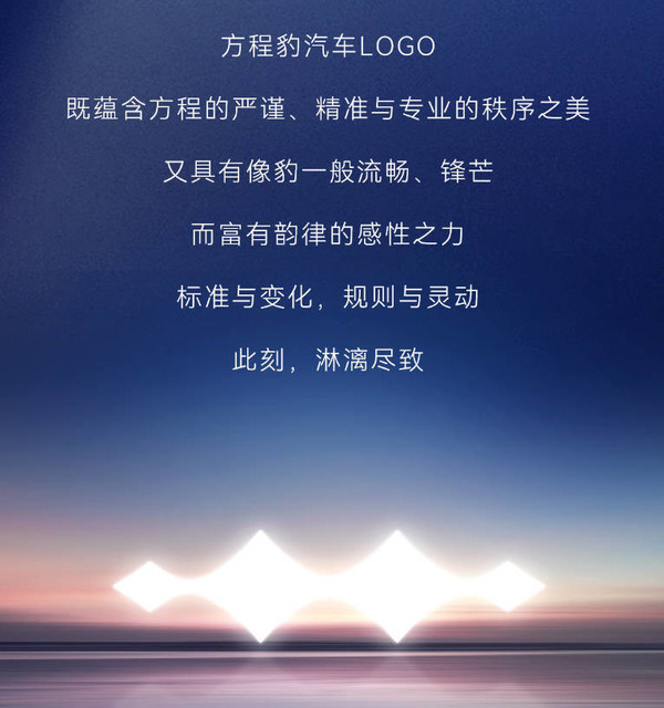 同时,方程豹汽车官方进一步解释称,这个设计的灵感和数学有很大的关系,他们从数学中萃取了元素,用星形线延展基地,使用了取自双纽线函数图形的结构灵感,进行对称变换,也如同著名的莫比乌斯环一样,表达着对未来的无限可能。据官方的图解,这个LOGO设计还代表了强悍的冲击力、野性的原始力、稳健的安全力、迅猛的反应力、个性的吸引力和美学的时尚力。最后,方程豹汽车总结:这个LOGO既蕴含了方程的严谨、精准与专业的秩序之美,又具有像豹一样流畅、锋芒而又富有韵律的感性之力。标准和变化,规则和灵动在这里展现得淋漓尽致。