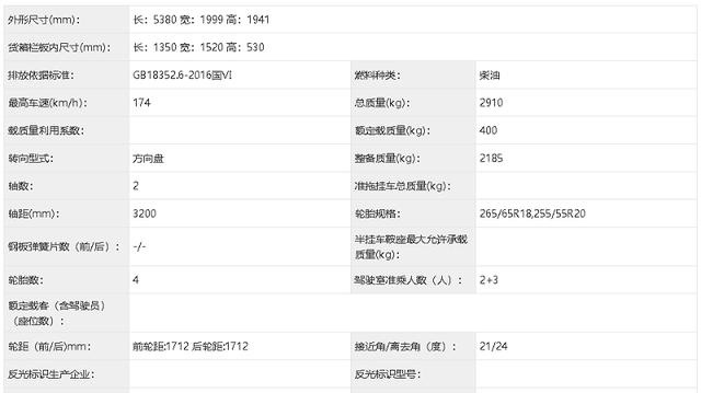 新车车身尺寸为5380×1999×1941mm,轴距为3200mm,货箱尺寸为1350×1520×530mm,轮胎规格为265/65R18、255/55R20,额定载质量为400kg。动力上,新车采用潍柴2.0柴油发动机,型号为WP2HQ190E61,最大净功率135kW,最高车速174km/h,百公里油耗申报值为7.8L、8.2L。