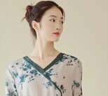 V领斜襟的上半身,拼接同色系撞色为整体增加了线条感,能中和印花复杂的视觉感受,看起来更利落一些,整体做工也会偏复杂一些。