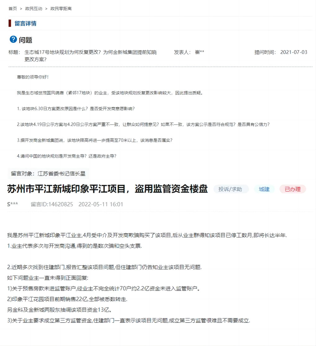 2021年7月,在天津市人民政府的留言板块,也有人质疑金新城置业为何提前知晓天津生态城规划的更改方案。