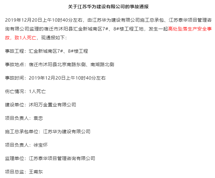 在土地出让纠纷审理期间,2019年12月20日,江苏省住房和城乡建设厅通报,江苏宿迁市沭阳县汇金新城南区7#、8#楼工程工地,发生一起高处坠落生产安全事故,致1人死亡。