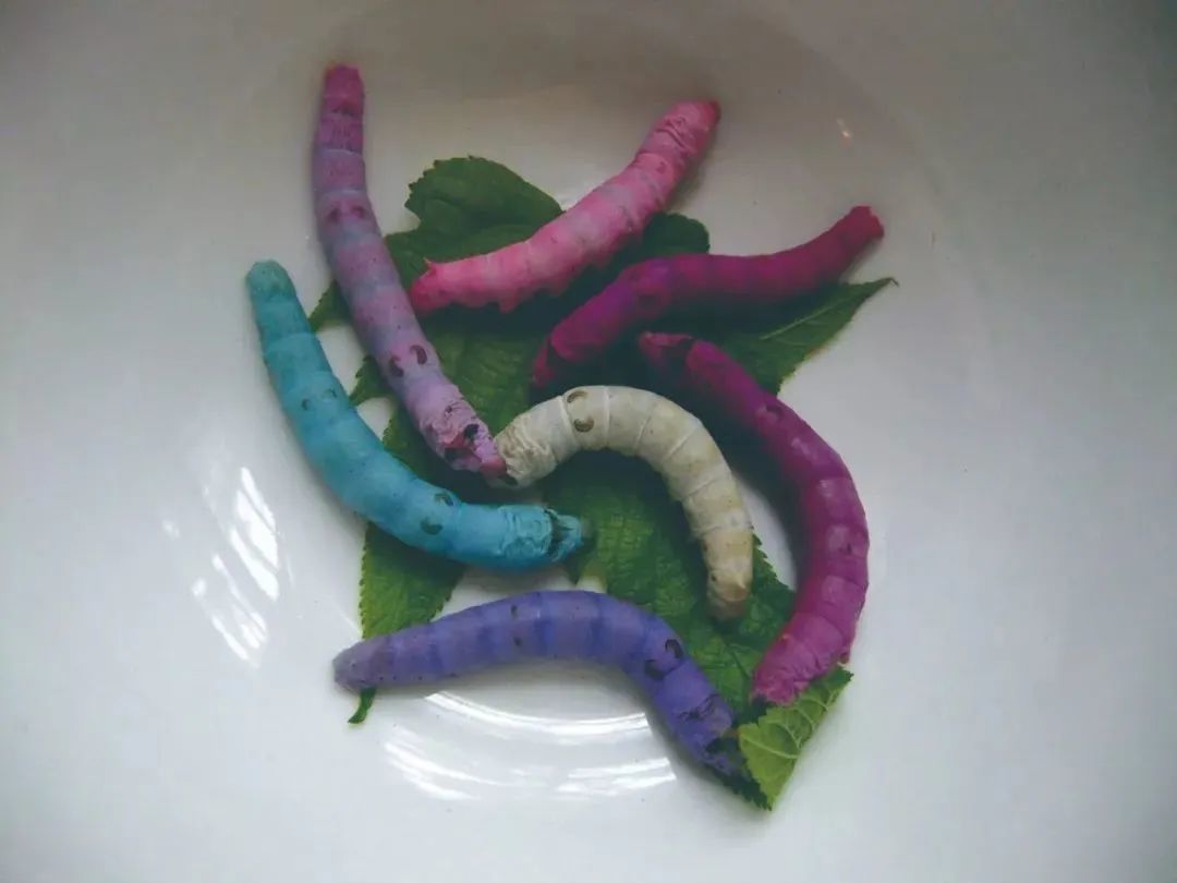 自然界中常见的蚕丝大多是白色或黄色的,而为了让它们织造出颜色多样的织物,往往要进行染色,彩蚕则可以直接吐出多种颜色的蚕丝。