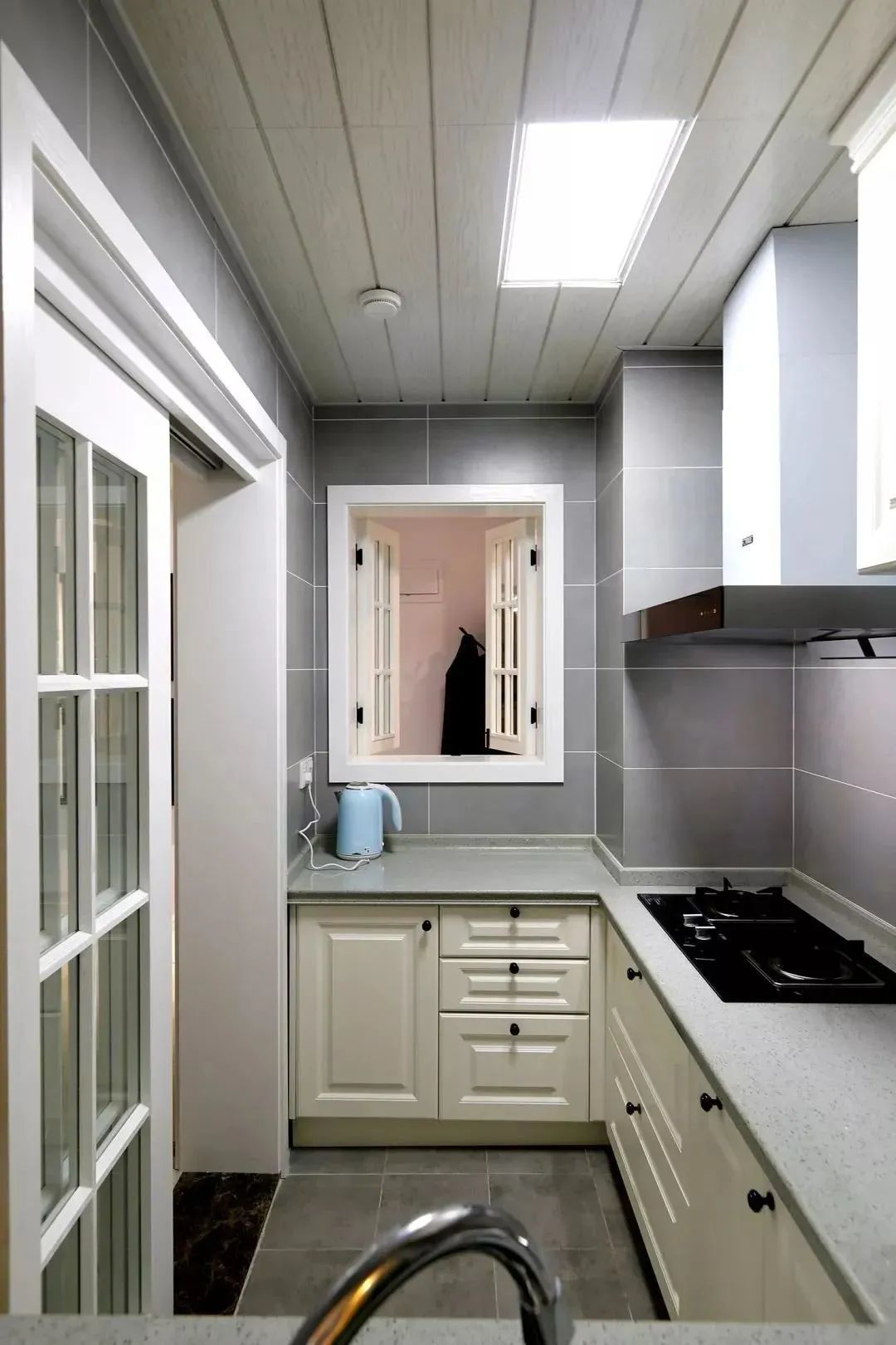 ▲厨房和餐厅之间用玻璃推拉门隔开,避免油烟的问题。在玄关和厨房之间还开了一个窗口,把两个空间连通,更显宽敞。
