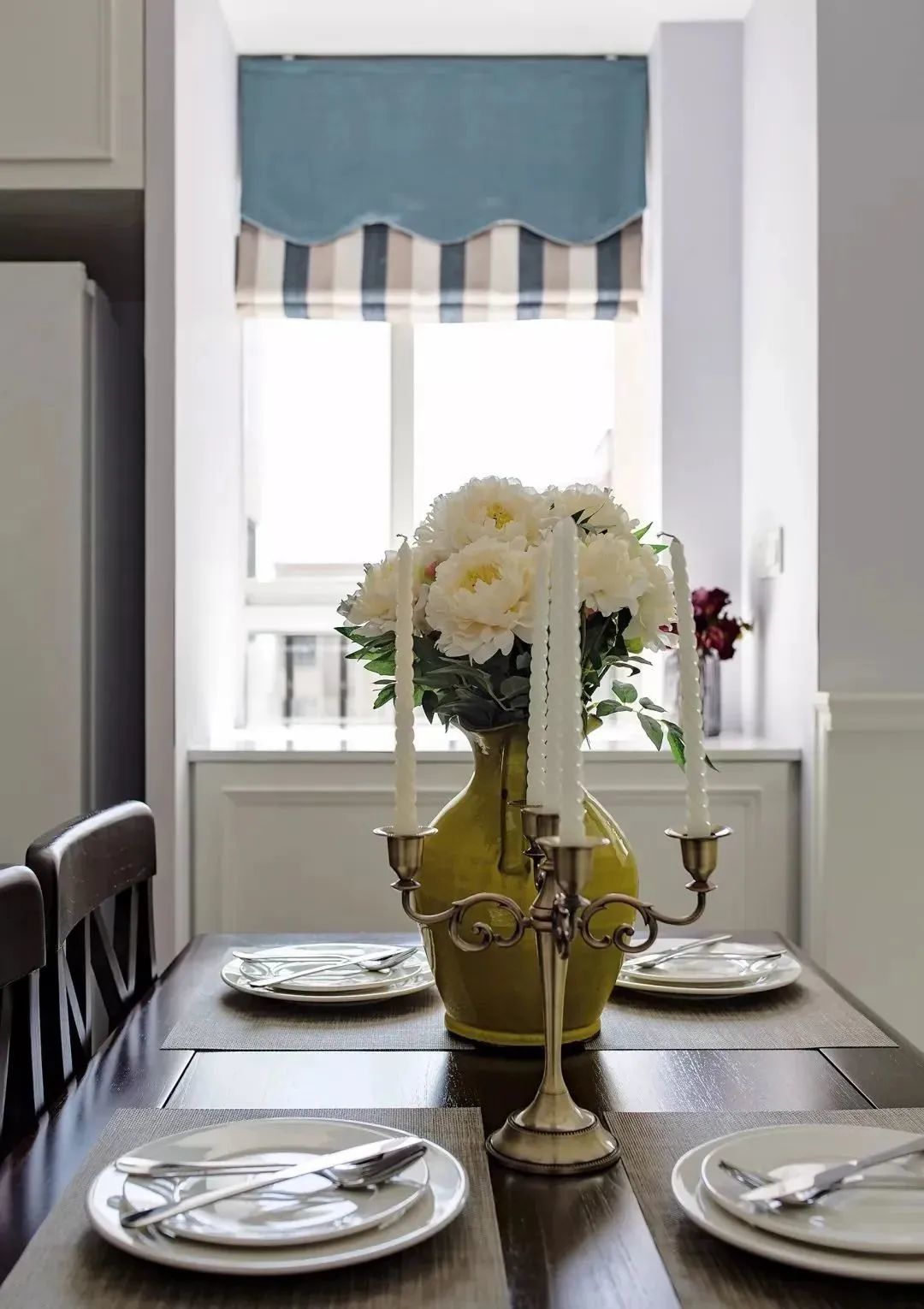 ▲餐厅处的设计比较简单,摆放在正中的餐桌椅,用浪漫的软装来打造一个优雅精致的进餐空间,角落里的冰箱嵌在柜子里,非常实用。