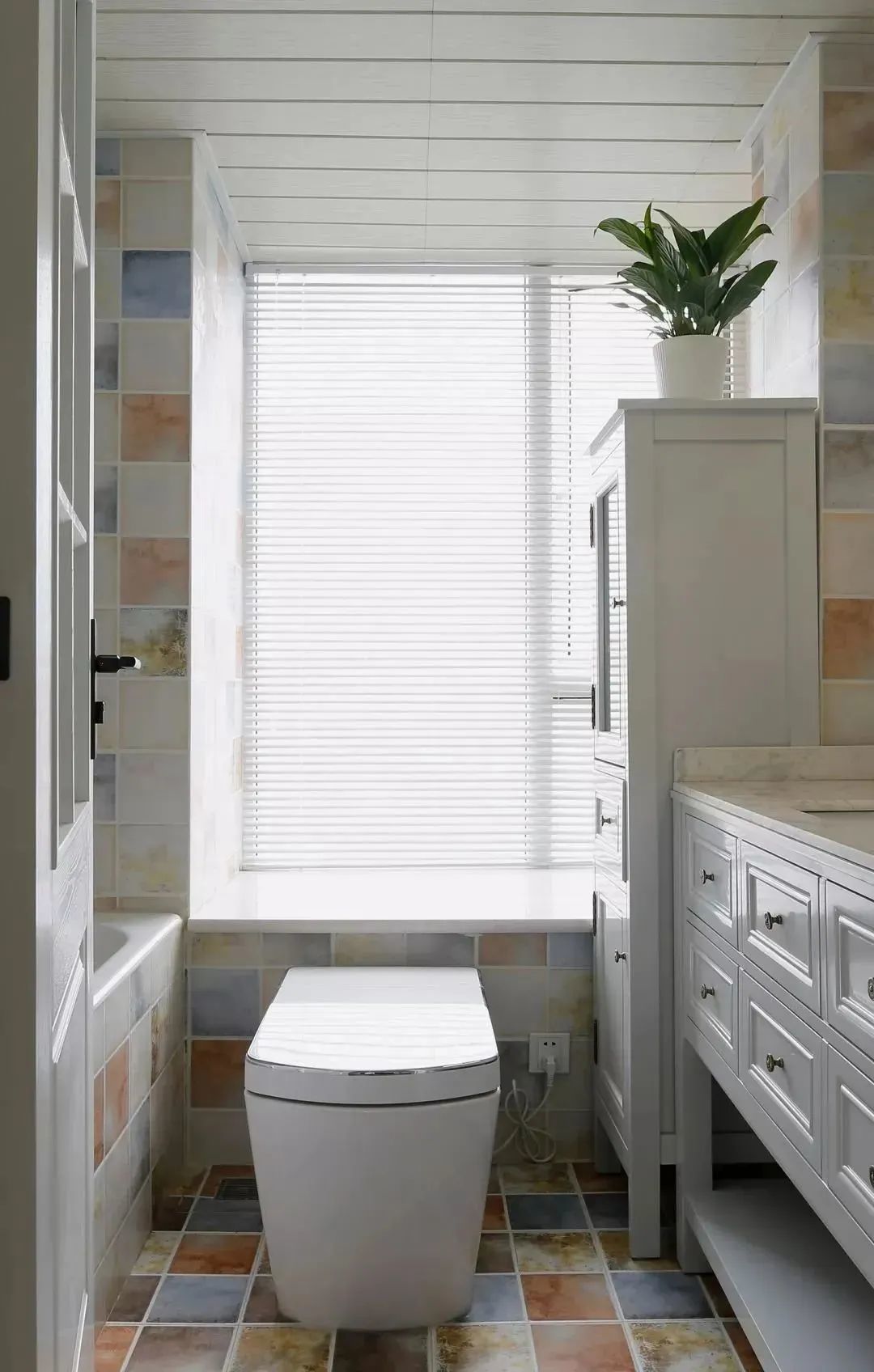 ▲最后是用仿古砖打造的卫生间空间,洗手台和浴缸分列马桶的两侧,洗手台还连着收纳柜一起设计,满足卫生间的收纳需求。