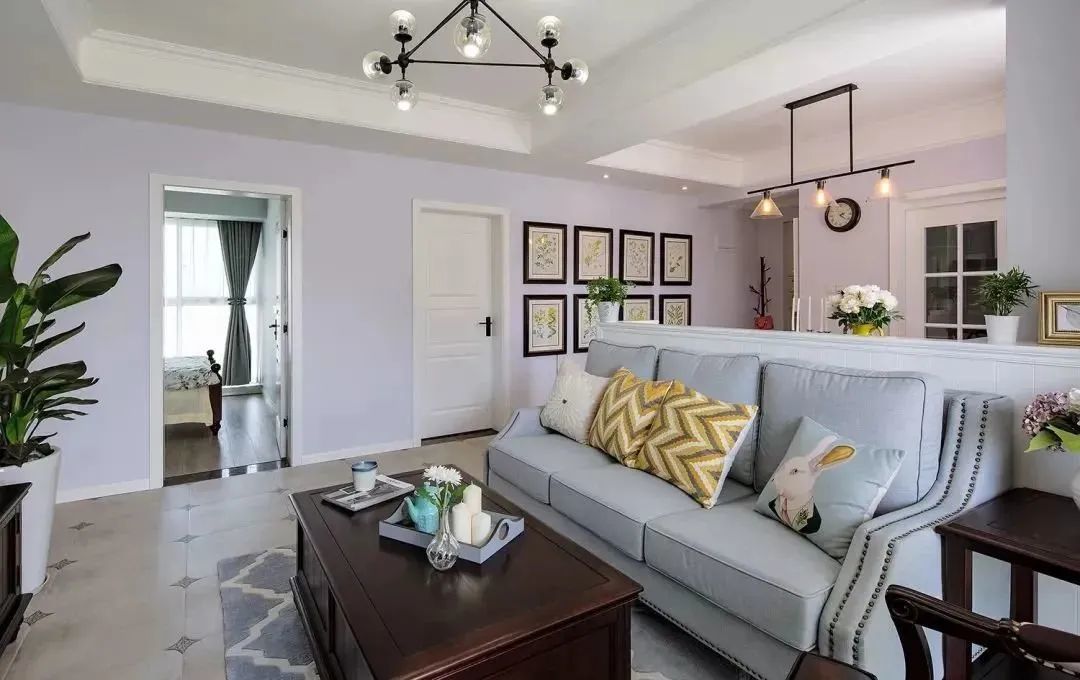主色调为比较少见的淡粉色,搭配厚重的美式家具,反而让人感觉到一丝浪漫感,墙面整齐排列的挂画也起到很好的装饰效果。