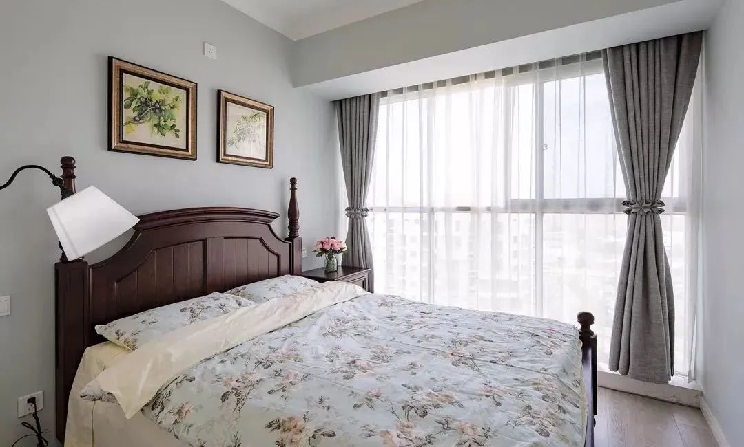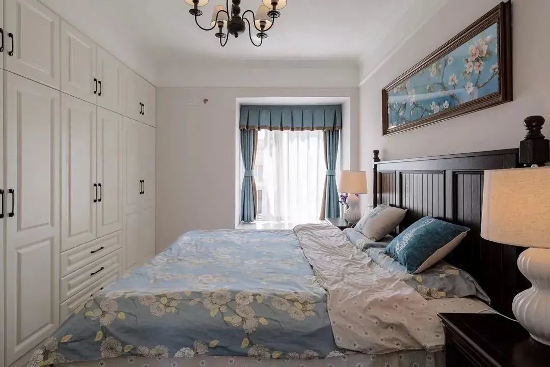 ▲主卧同样选择了厚重的美式家具和浪漫的软装、背景墙的搭配,还在床尾处设计了到顶的嵌入式衣柜,收纳空间非常充足。