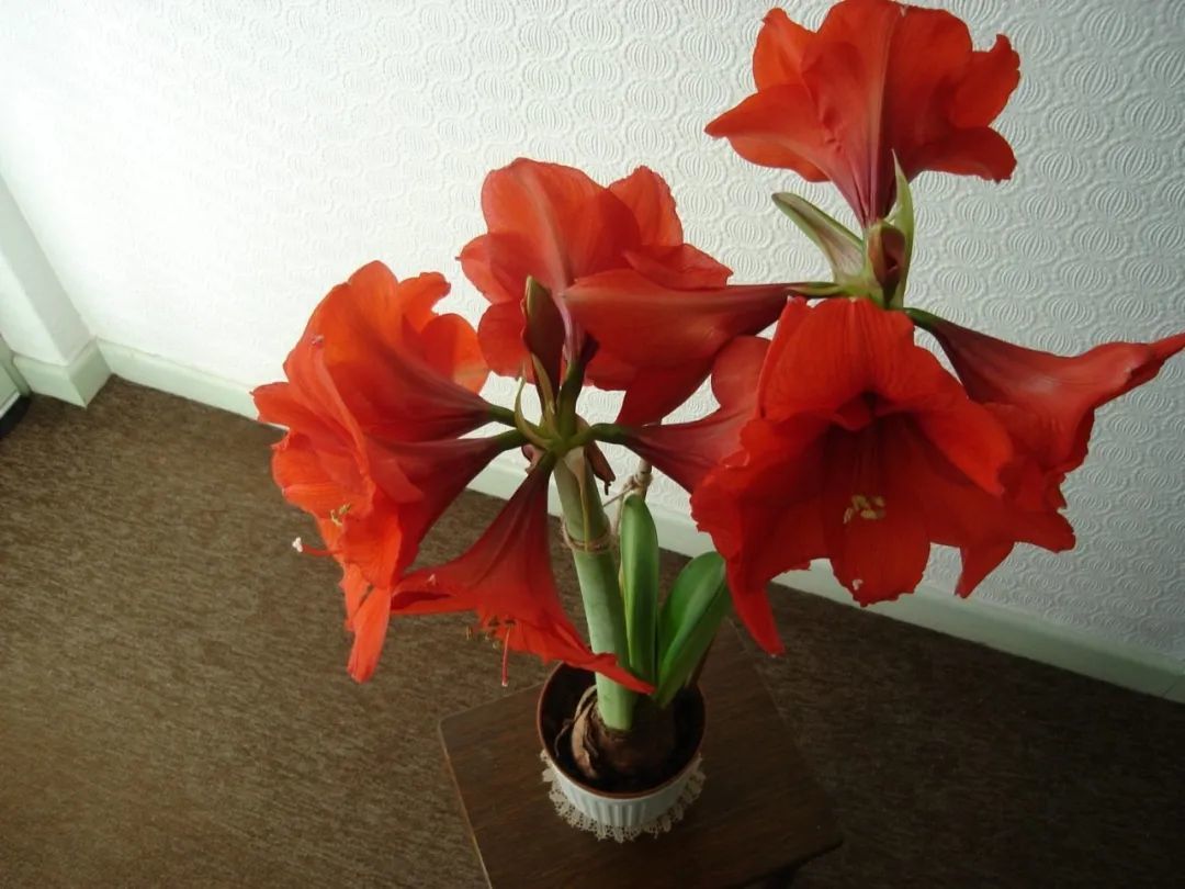 只要把朱顶红的种球稍微养得好一点,就可以保证年年开花,它和其他的种球花卉差别很大,其他花卉如郁金香、风信子、洋水仙等,它们的种球都是要深埋在土壤下面的,但朱顶红种球就要有1/3~1/2左右露出土面,避免将整个种球都种到土里,否则就会导致朱顶红只长叶子不开花,甚至容易引起种球腐烂。