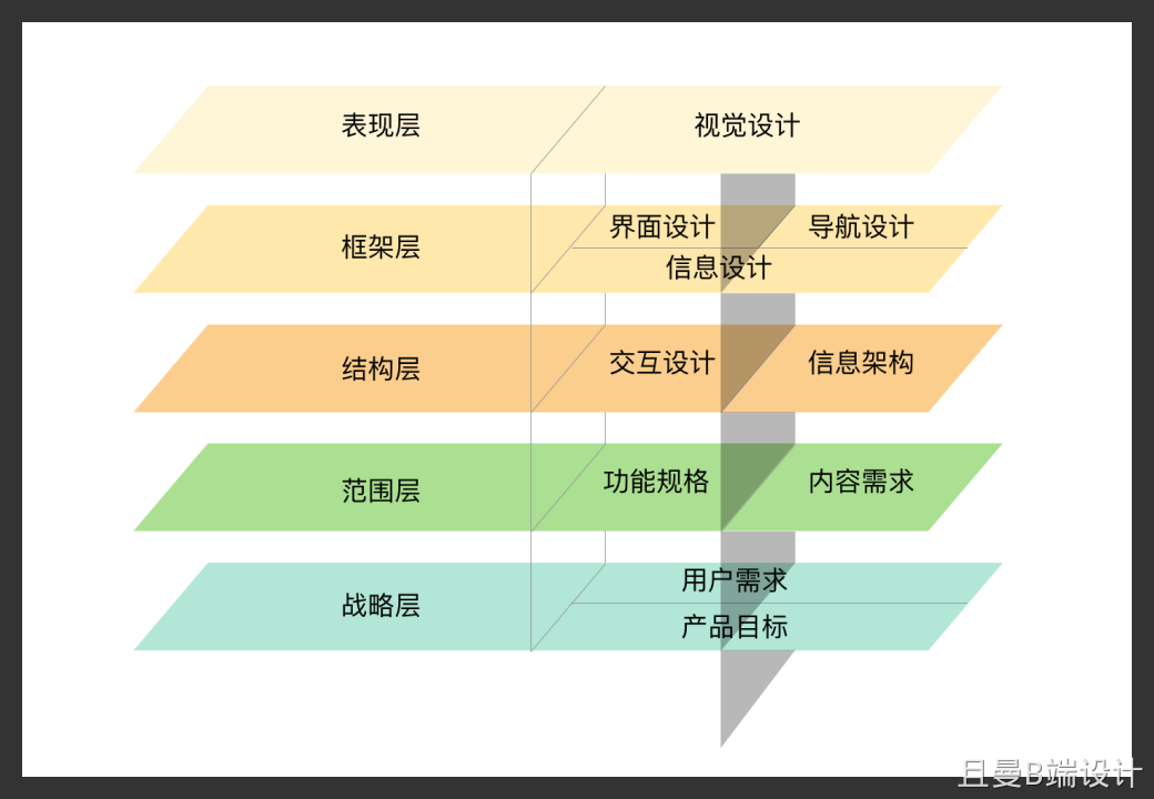 用户体验要素分析指从战略层、范围层、结构层、框架层、表现层 5 个层级,逐级的去分析。