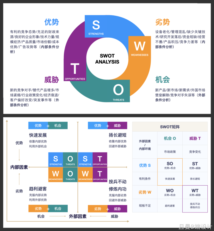 通过 SWOT 分析,可以帮助企业把资源和行动聚集在自己的强项和有最多机会的地方,并让企业的战略变得明朗,同行可以与其他的市场分析工具结合使用。