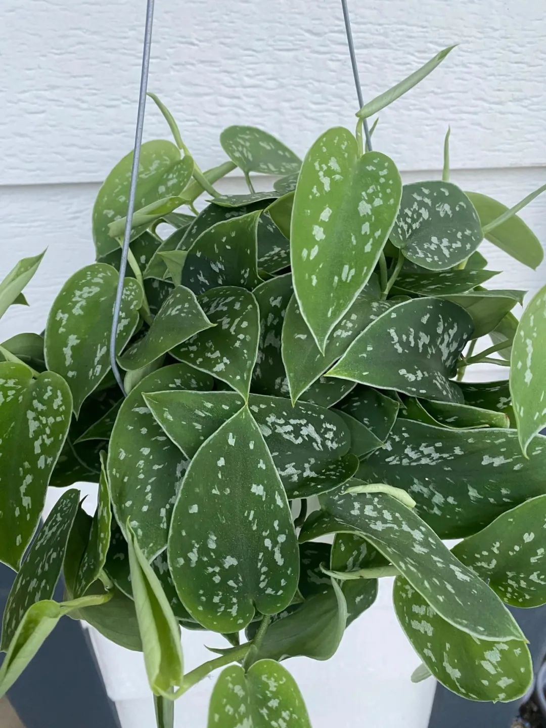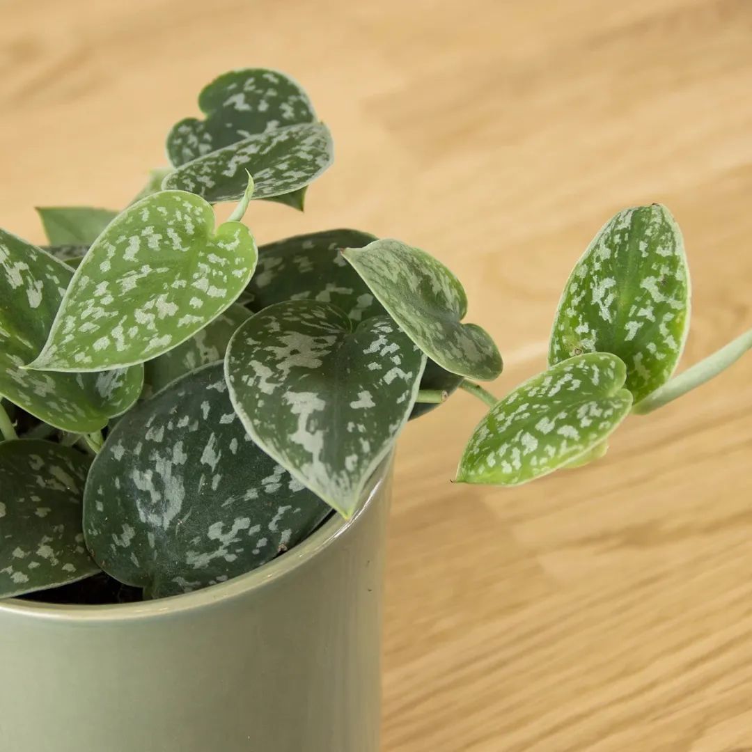 小叶银斑葛可以垂盆生长,也可以爬藤生长,它的叶子整体是呈心形的,叶片上那银白色斑点和斑纹是特别耐看的,就有一种高级的银灰色质感。