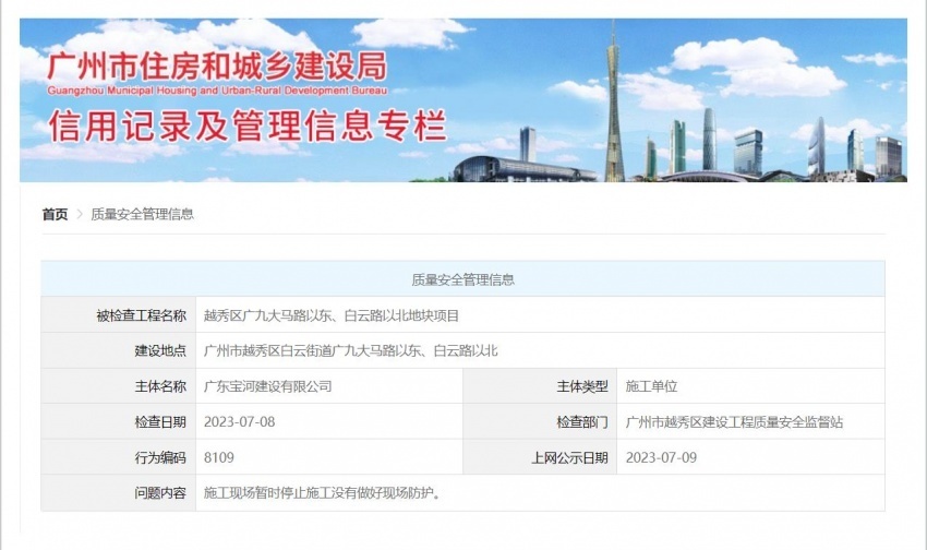 2023年7月9日,广州市住房和城乡建设局信用记录及管理信息专栏公示“越秀区广九大马路以东、白云路以北地块项目”质量安全管理信息。