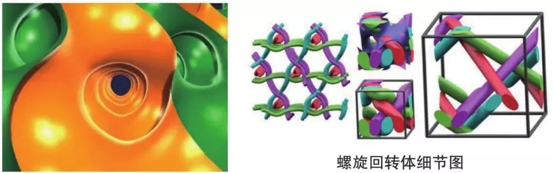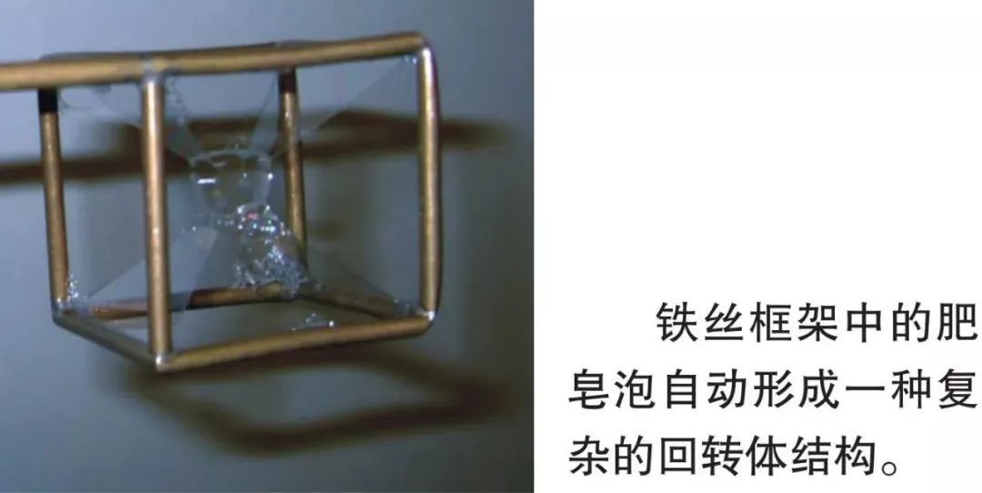 肥皂泡由于表面张力的缘故,总是尽可能地缩小自己的表面积,如果把一个铁丝立方体框架放入肥皂水中,再捞出来,立方体框架中的肥皂膜会呈现出一种有趣的结构,由于肥皂膜是透明的,我们可以看到肥皂膜相互紧贴,内部有一条条螺旋通道。由此结构,科学家再利用数学工具,设计出了一种在固定的框架中表面积最小的结构,这种结构被叫做“螺旋回转体”。由于表面积最小,采用这种结构的器材可以耗材最少,最轻,但却具有很强的抗压抗拉性能。