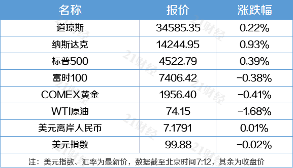 1、美国三大股指全线收涨,道指涨0.22%,纳指涨0.93%,标普500指数涨0.39%。英特尔涨3.68%,摩根大通涨2.39%,领涨道指。中概股涨跌不一,盛德财富涨45.67%,大猩猩科技跌12.41%。