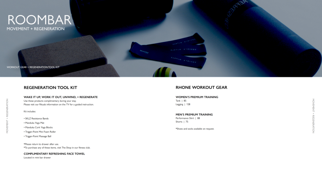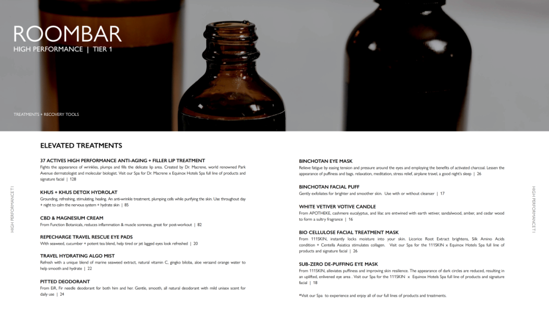 RoomBar 销售的美容产品系列之一来自纽约市的整形外科医生 Lara Devgan 博士,Equinox Hotel Spa 与她合作提供独家面部护理。此外,水疗中心和 RoomBar 提供法国奢华护肤品牌 Biologique Recherche的产品。