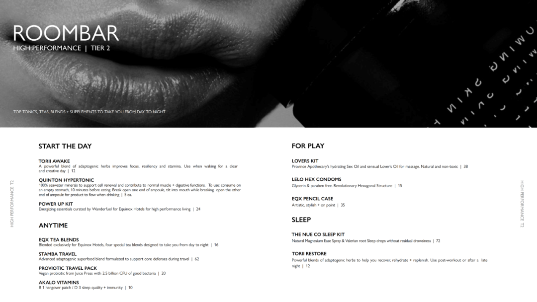 坐标纽约的这家奢华健身风酒店Equinox通过对美妆护肤、酒水、简易健身器材、瑜伽服等单品的精致选品,再加上工业风和运动风的吧台设计,来表达其为客人提供健身房相同体验的承诺 ——“终极的高性能豪华生活方式”。高端健身房Equinox利用价格筛选出了对生活品质要求最高的一部分人,而将健身相关的消耗品作为Roombar(客房吧)主线产品的这一战略也能更精准地触达到这一类高净值人群的关注点,并成为维持圈层感和忠诚度的重中之重,例如选用北美超小众品牌111 skin的生物纤维素护肤面膜和零度抗浮肿眼膜,纽约皮肤医学专家Dr. Macrene和酒店联名推出的活性高效抗衰老+填充唇部护理套装等。