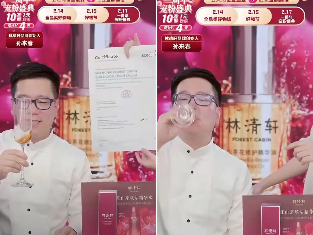 当天,以助播身份助阵“香菇来了”直播-林清轩小专场的孙来春,在介绍到新品“红山茶焕活精华水”时,为了更好地展示产品特性,特意将精华水倒入高脚杯中,一边展示产品的色泽,一边亮出这款精华水已获得的欧盟ECOCERT天然认证报告。一些用户随即在评论区“挑战”:你说是天然的,你咋不喝了呢?看到留言后的孙来春便端起了高脚杯将这款精华水一饮而尽。
