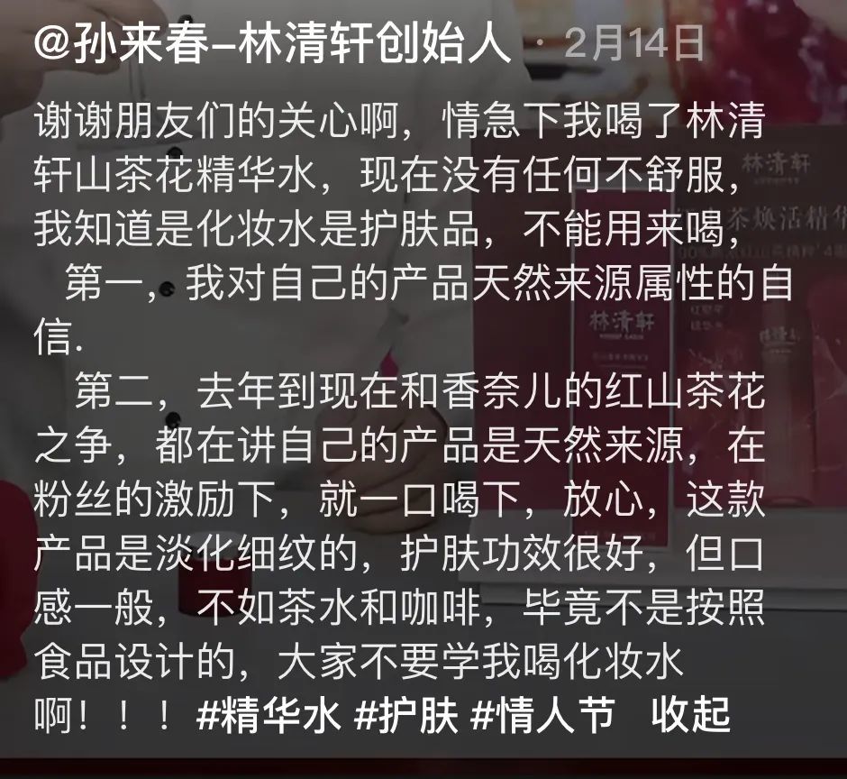 随后,孙来春也在朋友圈和抖音号上做出回应,称“自己知道护肤品不能用来喝,当时是在粉丝的激励下才有了这种举动,希望大家不要效仿。”另一方面,他也表示“对自己的产品天然来源属性有足够的自信,且产品的护肤功效很好。”
