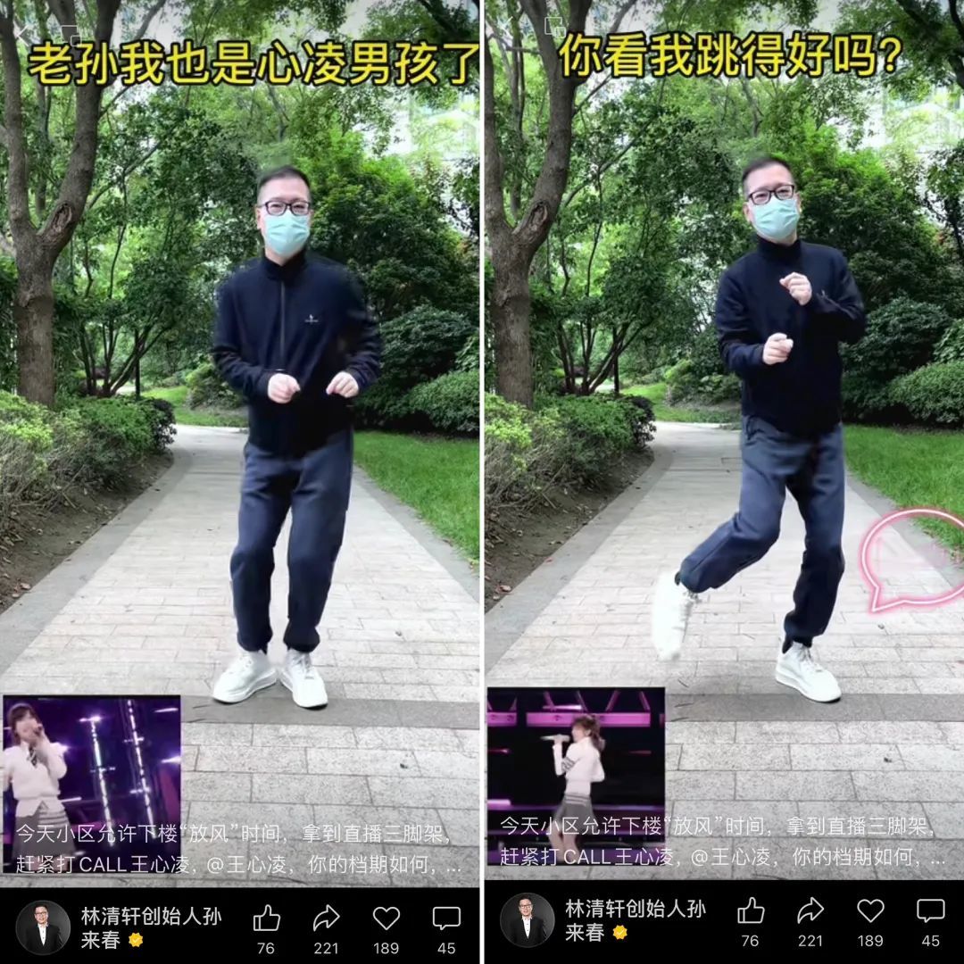 2022年5月,被疫情封控在家的孙来春在“放风”时间,在小区楼下架起三脚架,对着镜头跳起了王心凌的经典舞蹈,品牌创始人和王心凌男孩之间带来的强烈反差感让这条视频在各平台引来了超乎以往的关注,这不仅让孙来春信心倍增,也让他意识到真实和接地气在创始人IP打造中的重要性。