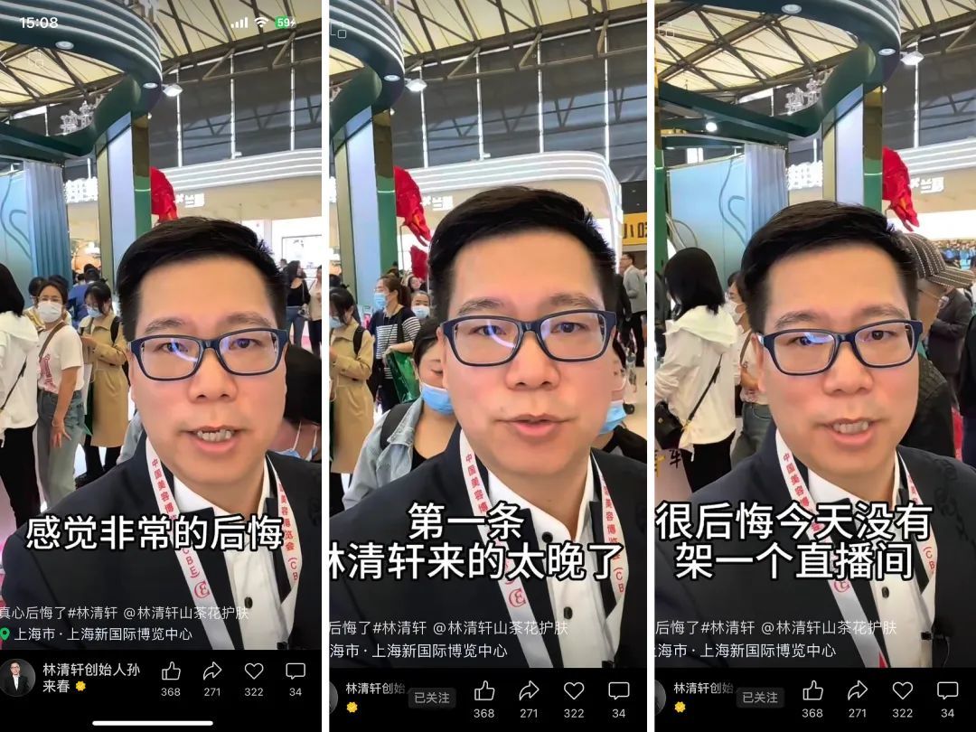 今年5月,林清轩首次参加了在上海举办的中国美容博览会。展会现场,孙来春随手拍摄了多条林清轩展会现场的视频发布在视频号上。谁曾想,这几条视频发布后,孙来春的账号粉丝增长了3倍,且基本都是化妆品行业的相关从业人员,人群十分精准。