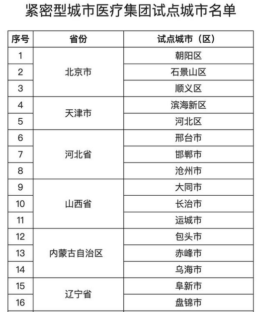 国家卫生健康委、国家发展改革委、财政部等6部门近日联合印发通知,公布了北京市朝阳区、山西省大同市等81个紧密型城市医疗集团建设试点城市(地级市和直辖市的区)。到2023年上半年,试点城市完成紧密型城市医疗集团网格化布局;到2023年底,基本形成系统集成的配套政策;到2025年,试点城市紧密型城市医疗集团管理体制更加科学,运行机制更加完善,服务模式更加优化,医疗资源供需更加匹配,就医格局更加合理,试点工作形成可复制、可推广的有益经验。