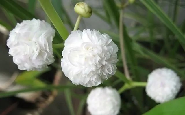 崇拜慈姑的花朵是特别精致迷人的花瓣,重重叠叠,花序较长,像一个个白色的绒球挂在上面。