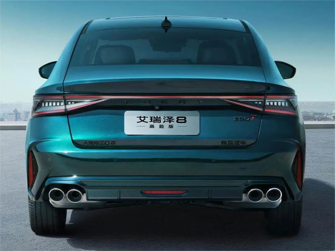 车尾部分,艾瑞泽8高能版相较于现款1.6T车型最明显的区别就是前者换装了粗壮的双边共四出排气,大幅提升了整车的运动氛围,也更加符合它2.0T的身份。