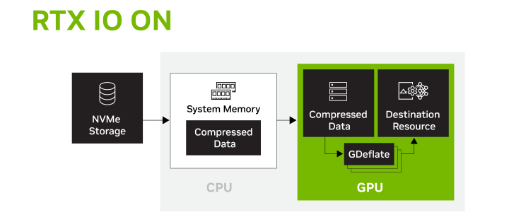 NVIDIA RTX IO利用GPU解压缩来处理较小的数据包,从而实现更快的加载速度和更低的CPU利用率,并允许开发者创建具有大量丰富、细腻世界的新一代游戏。NVIDIA RTX IO利用GeForce GPU的先进架构,将数十个CPU核心的工作负载转移到GPU,从而实现更快的游戏加载,并为大型、超精细的开放世界游戏的新时代打开大门。RTX IO基于GDeflate,这是一种由NVIDIA提供的开放GPU压缩标准,微软的DirectStorage和新的Vulkan扩展都使用该标准。