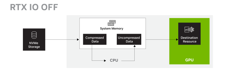 传统方式中,数据从磁盘驱动器发送到CPU,通过系统内存解压缩,然后发送到GPU。该系统的设计并未考虑当今PCIe 4.0和5.0 NVME SSD的功能,仅使用了其功能的一小部分。CPU和系统内存的瓶颈,再加上更大的素材资源,限制了较新SSD的优势,导致资源加载速度变慢,这可能会导致游戏中纹理突现或加载时间变长。
