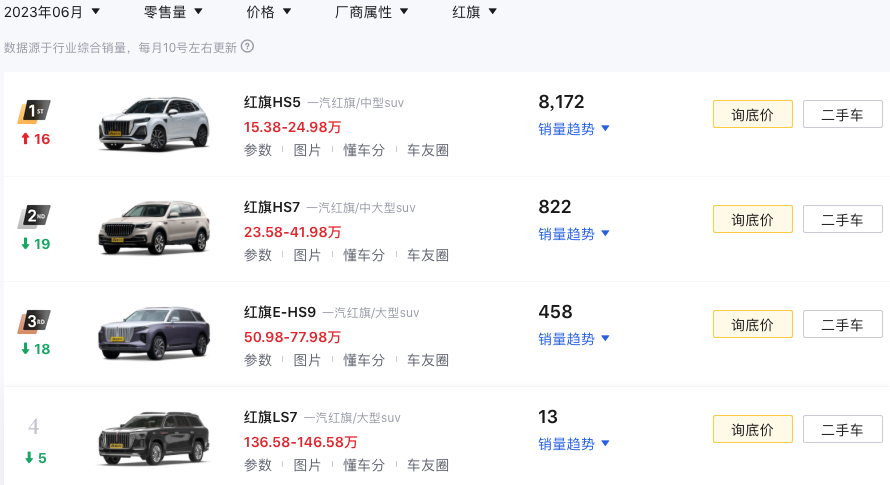 截至目前,一汽红旗现有的产品包括轿车家族和SUV家族两大产品体系,覆盖15-70万元中高端市场。其中,SUV家族车型包括EHS9、HS5、HS7、LS7等,HS5车型是红旗在SUV家族产品中的走量车型之一。以今年6月销量为例,销量最高的红旗HS5为8172辆,其次为HS7,仅822辆。