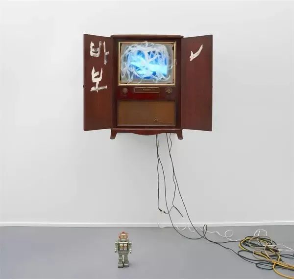 白南准《无题》;老式电视机柜,单通道影像(彩色,无声),丙烯酸涂料,玩具机器人;尺寸可变;1996
