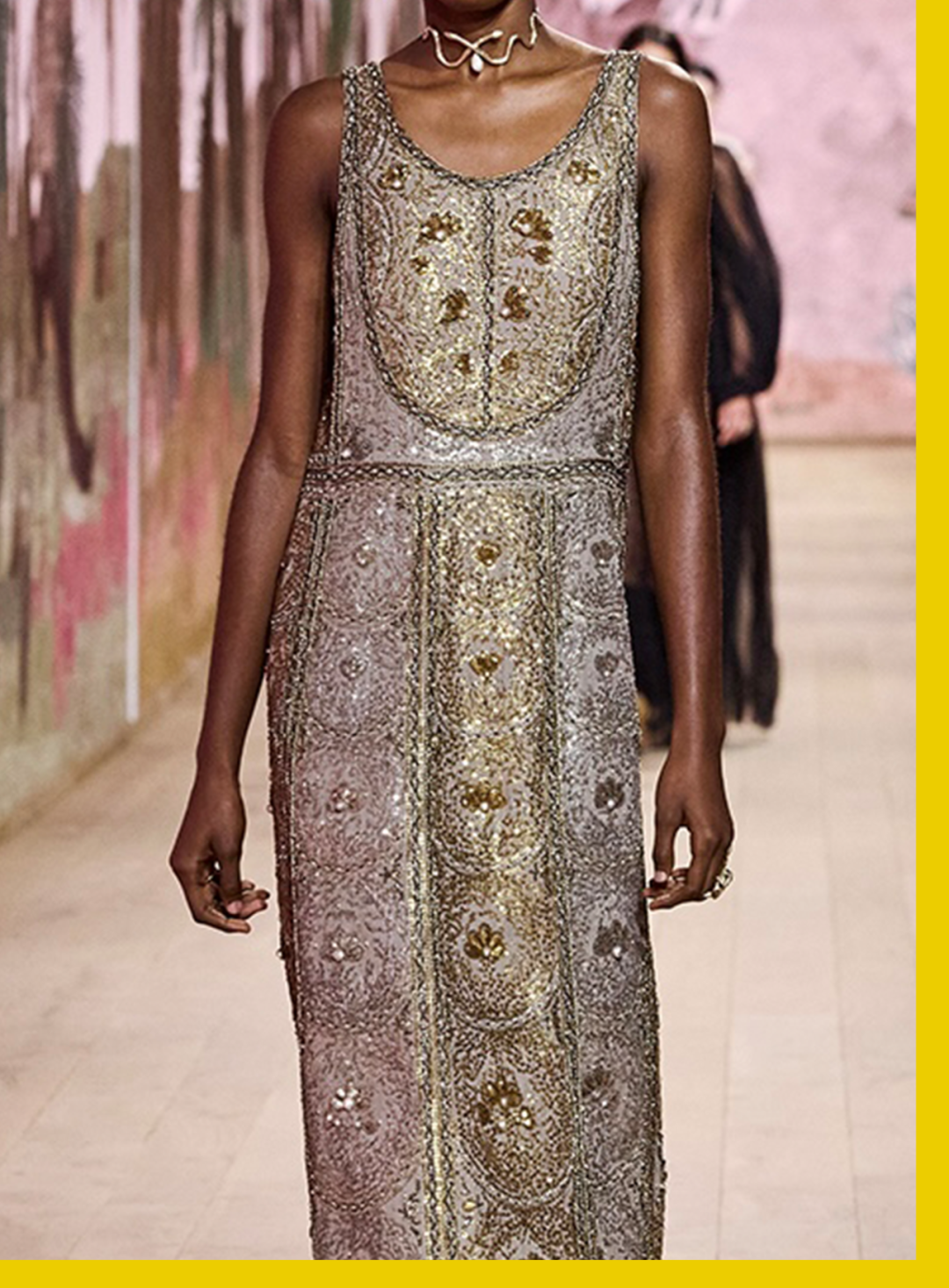 尽管轮廓简约,但是本季服装的复杂风格所需的大量细节处理只有高级定制的技艺才能承担得起。Maria Grazia Chiuri说:“高级定制是慢时尚,从设计制作到使用穿着,它的周期可以慢到‘永恒’。”