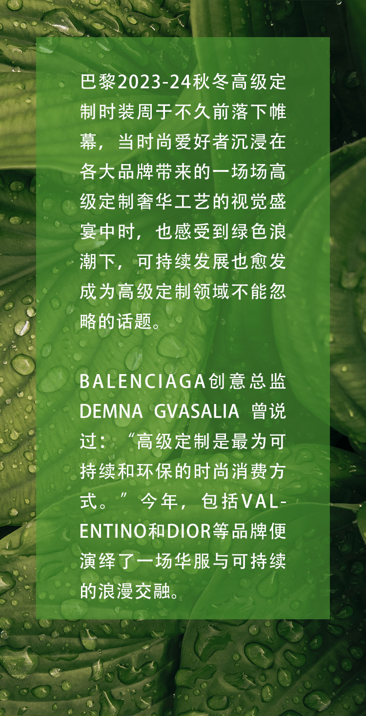 如今看来,包括在 Balenciaga 在内的老牌时装屋,以每年巴黎高定时装周为舞台,在展示顶级创意设计和精湛工巧技艺的同时,也切实通过服装设计理念、秀场布置以及面料源头采买等各个层面,践行可持续环保理念。在刚刚落幕的巴黎2023-24秋冬高级定制时装周上,Valentino、Dior等品牌便演绎了一场华服与可持续的浪漫交融。